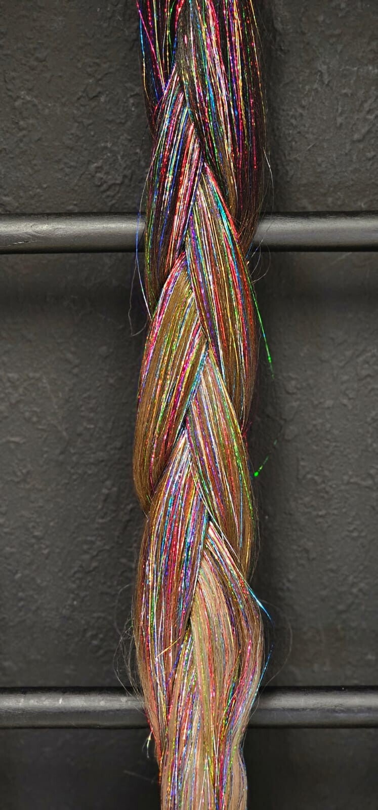 Het haar is voorzien van tinsel voor een subtiele, glinsterende finish.